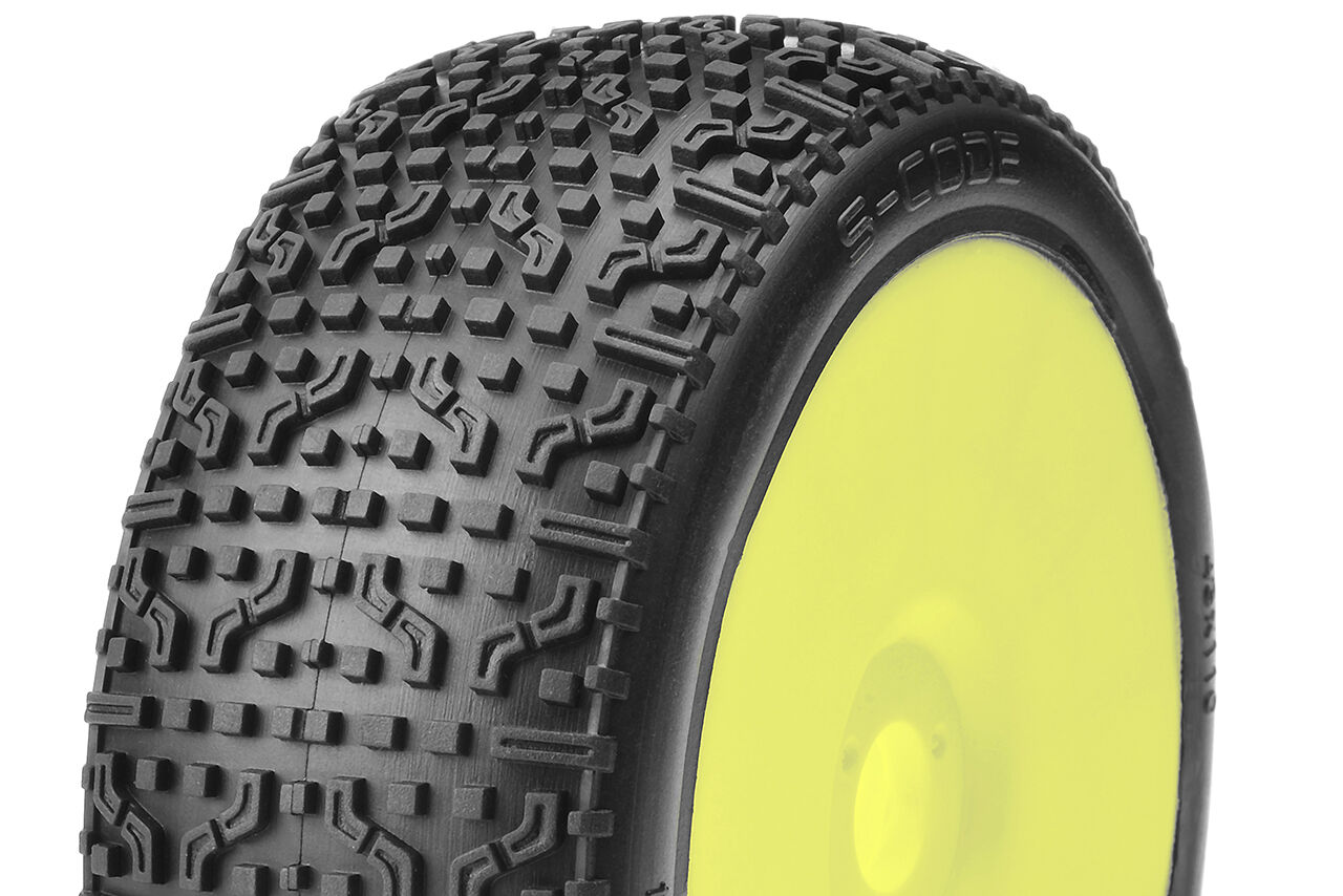 Captic Racing - S-CODE - 1/8 Buggy Tires Mounted - CR-2 (Medium-Soft) Racing Compound - Yellow Rims - 1 Pair
