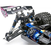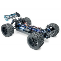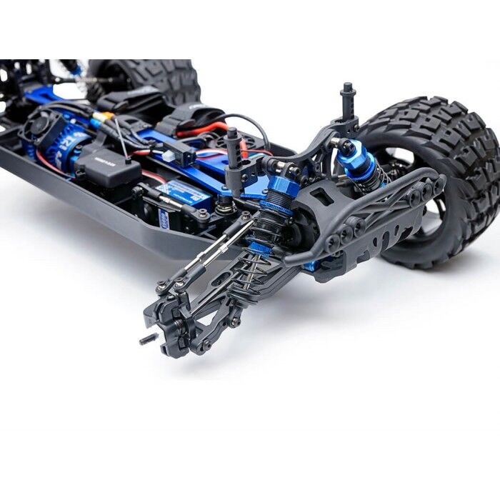 Front, rear and centre geared differentials with metal gears provide smooth power transfer through front and rear universal driveshafts, finished with aluminium wheel hexes. A heavy-duty moulded tub chassis houses all components, while the updated geometry rear shock tower supports new heavy-duty body mounts.