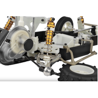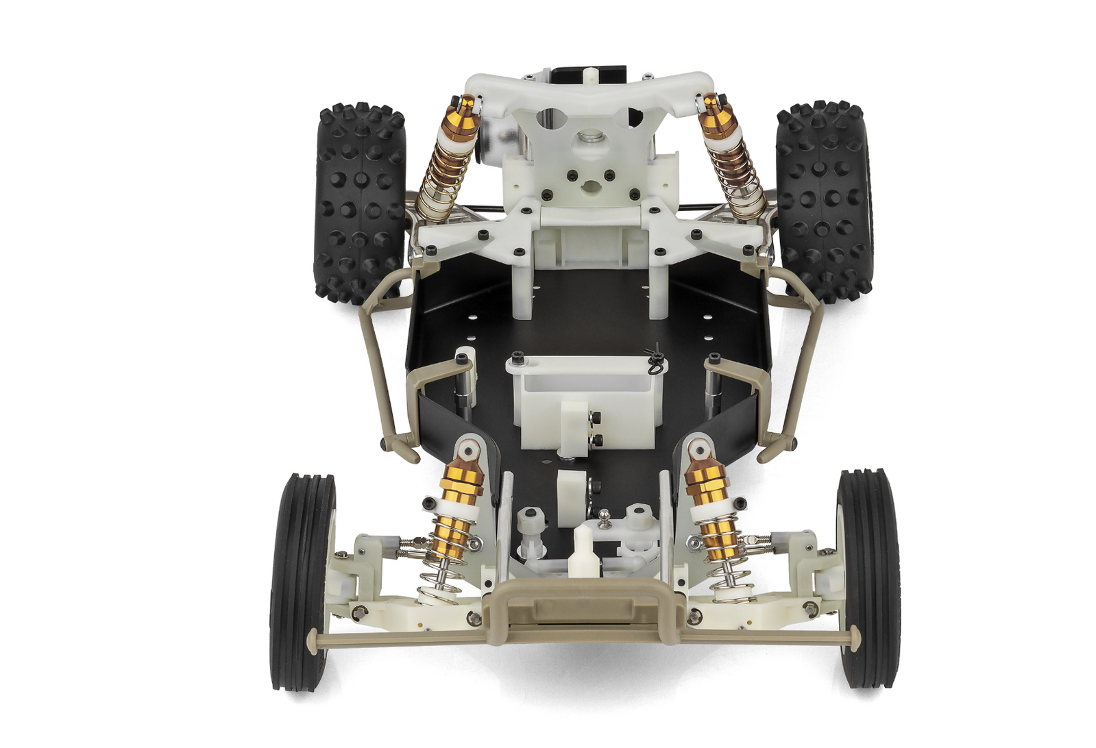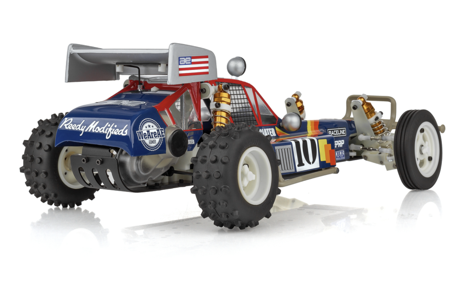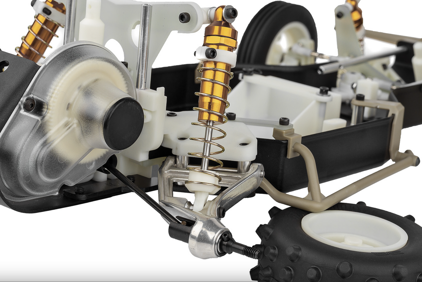 High-end details complete the package, including threaded steel turnbuckles for precise adjustability, gold anodized aluminum long-travel shocks for classic performance and looks, and a factory-correct Protech body set with authentic decals that capture the unmistakable spirit of the box art imagery.