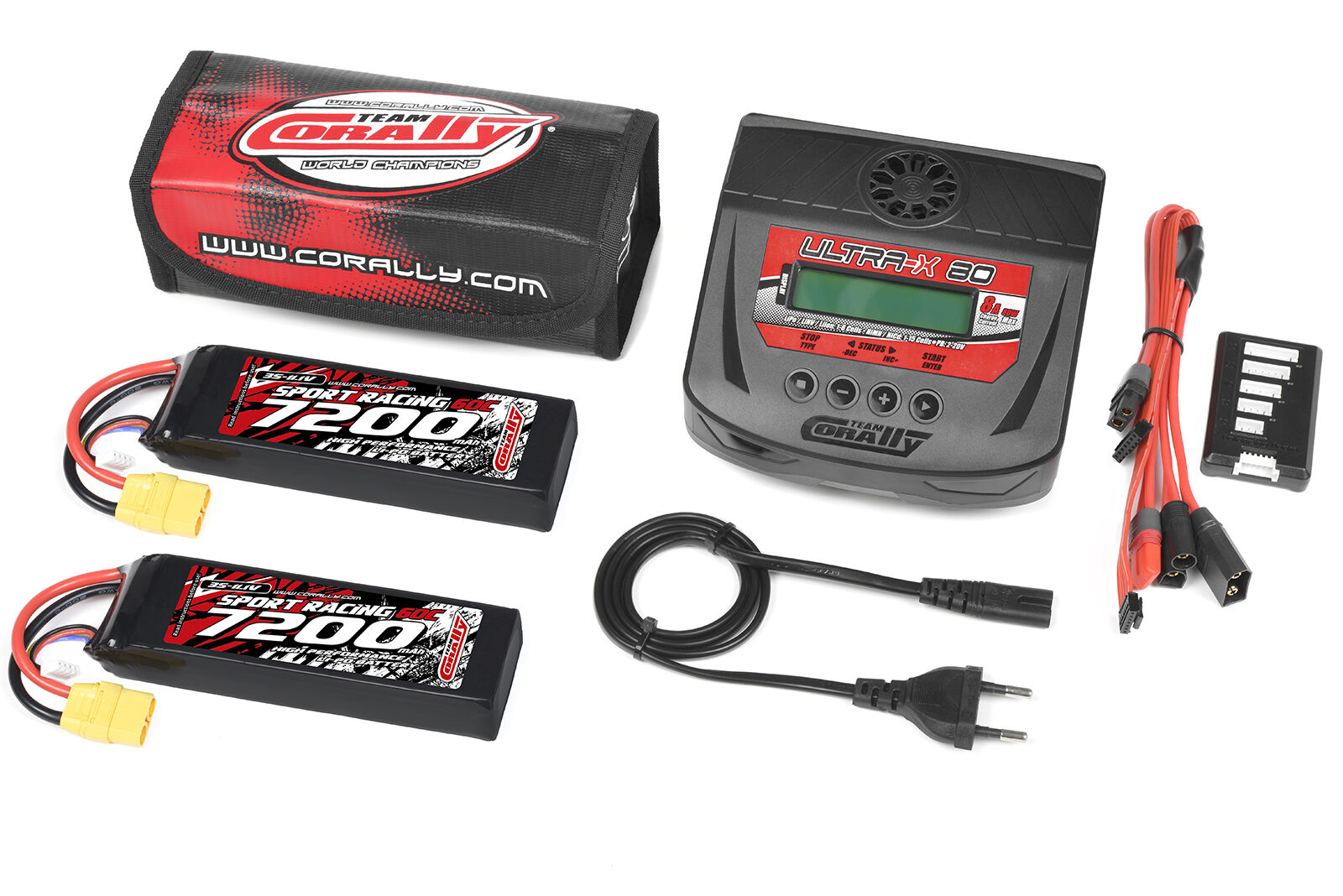 Team Corally - Energy Pack - 2X Lipo 60C - 7200Mah - 3S - XT-90 - Semi-Soft Case + Ultra-X 80 - 1-6S AC/DC Charger + Lipo Safety Bag + Charge-Balance