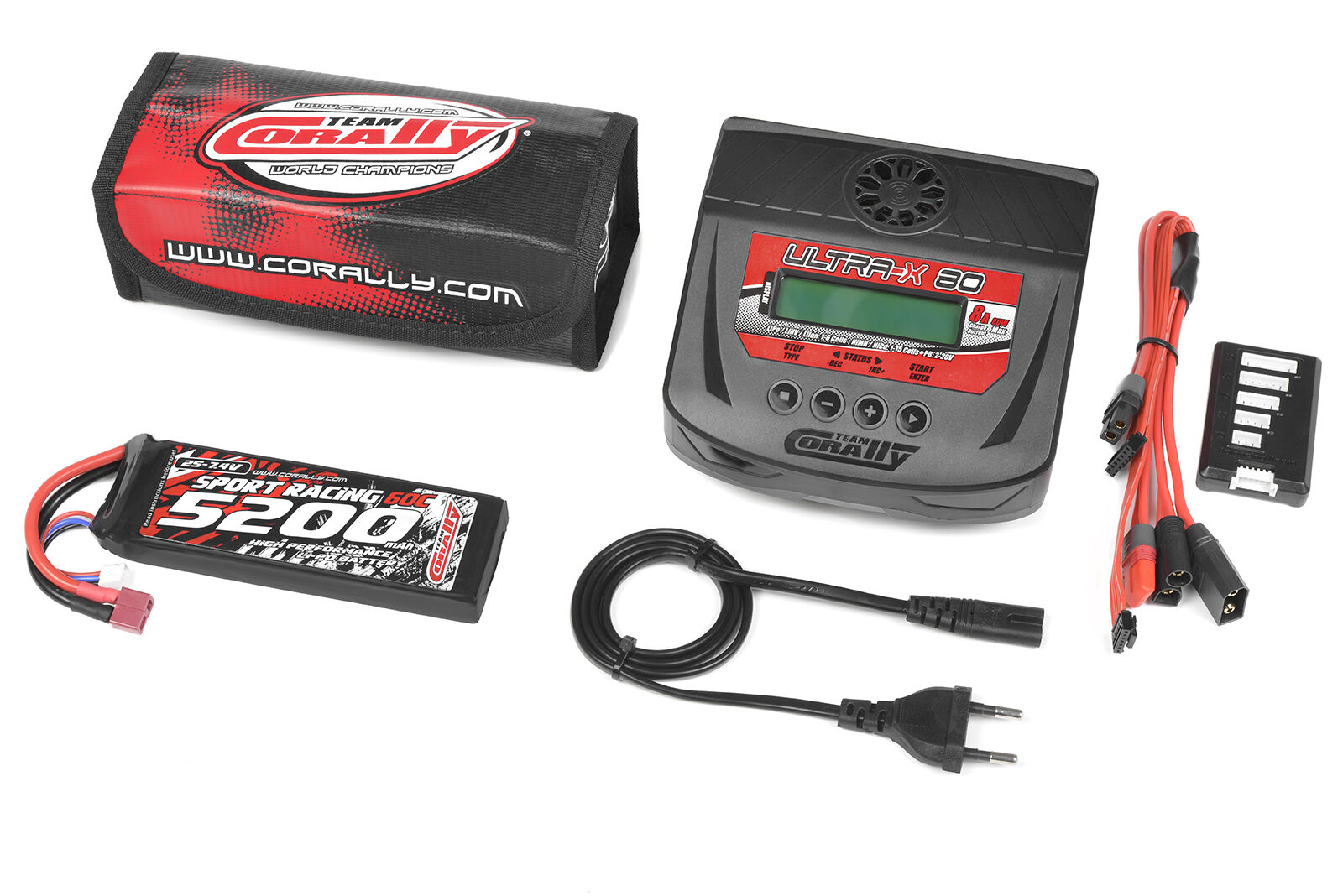 Team Corally - Energy Pack - Lipo 60C - 5200MAH - 2S - T-Plug - Semi-Soft Case + Ultra-X 80 - 1-6S AC/DC Charger + Lipo Safety Bag + Charge-Balance Le