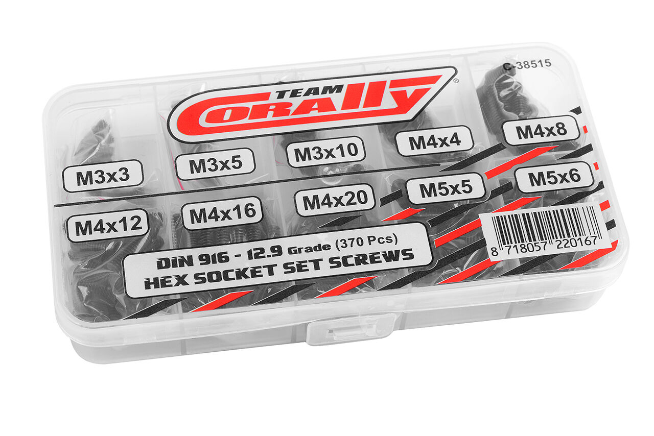 Team Corally - Screw Set - Set Screws - M3 - M4 - M5 - DIN 916 - Steel Black - 12.9 Grade - 10 Sizes - 370 pcs